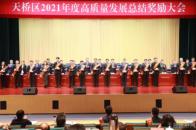 2月27日上午,济南市天桥区2021年度高质量发展总结奖励大会召开。区委书记韩伟出席会议并讲话,区委副书记、区长张庆国主持会议。大会对获奖企业、单位和个人代表进行了表彰,山东极悦娱乐集团有限公司公司党委书记、董事长杨耀东获得“2021年度经济建设功勋奖”荣誉称号。